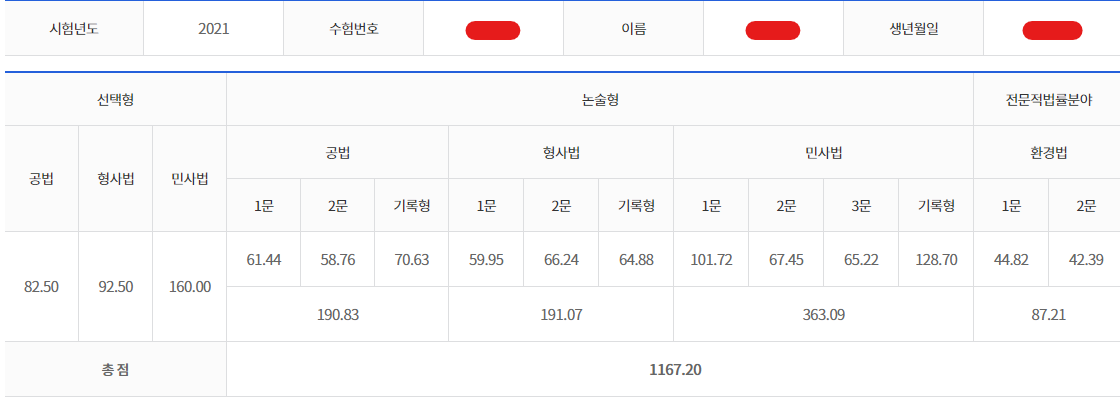 - 공법은 항상 자신있던 부분인데도 공사례 점수가 생각보다 낮았고, 오히려 민사3문(상법)과 민기록이 생각보다 잘나왔으며, 나머지는 생각한 정도로 나왔다. 공사례 점수는 이해하기 어렵다. 비례원칙 일반론에 배점이 있나..??