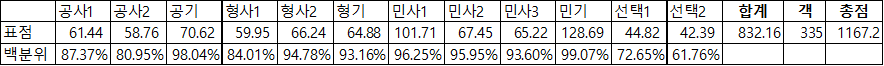 합격컷은 895.85. 그에 따른 객컷은 101.34개